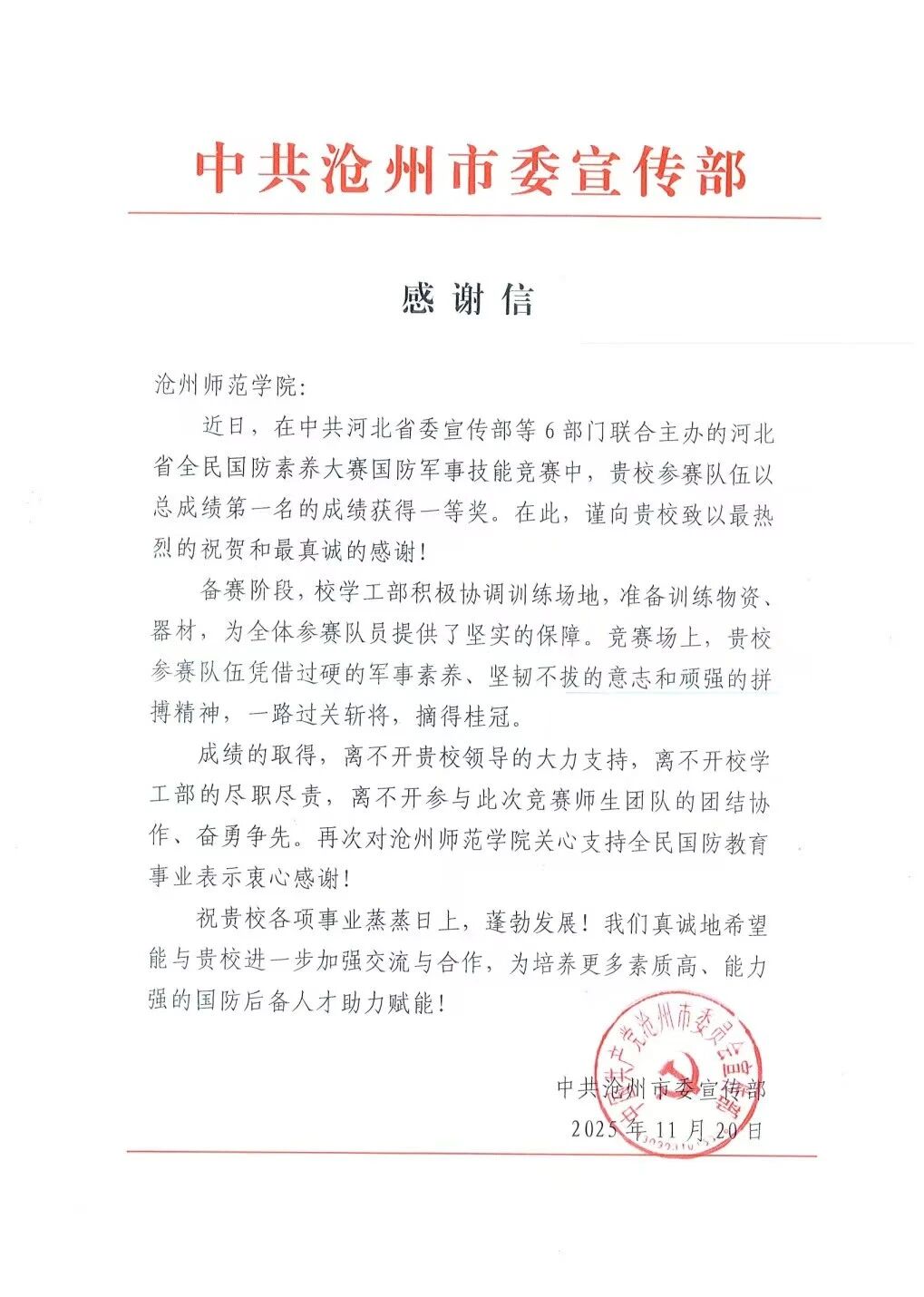 沧州市委宣传部给威廉官网中国官方网站发来感谢信