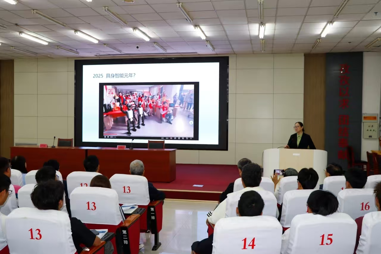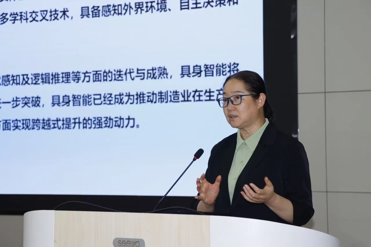 赵晓光带领师生回顾了机器人技术的发展历程,介绍了工业机器人、服务机器人、仿生机器人、人形机器人等多种形态。系统阐释了具身智能的概念,围绕机器人领域的模仿学习、机器视觉、软体机器人和大模型技术四大研究方向,全面剖析了人工智能与智能制造业未来发展的趋势,指出具身智能将成为颠覆制造业的下一个浪潮。她表示智能机器人发展前景广阔,希望师生结合区域产业发展实际,探索人工智能与地方产业的结合路径,为我国人工智能和新质生产力的发展作出贡献。