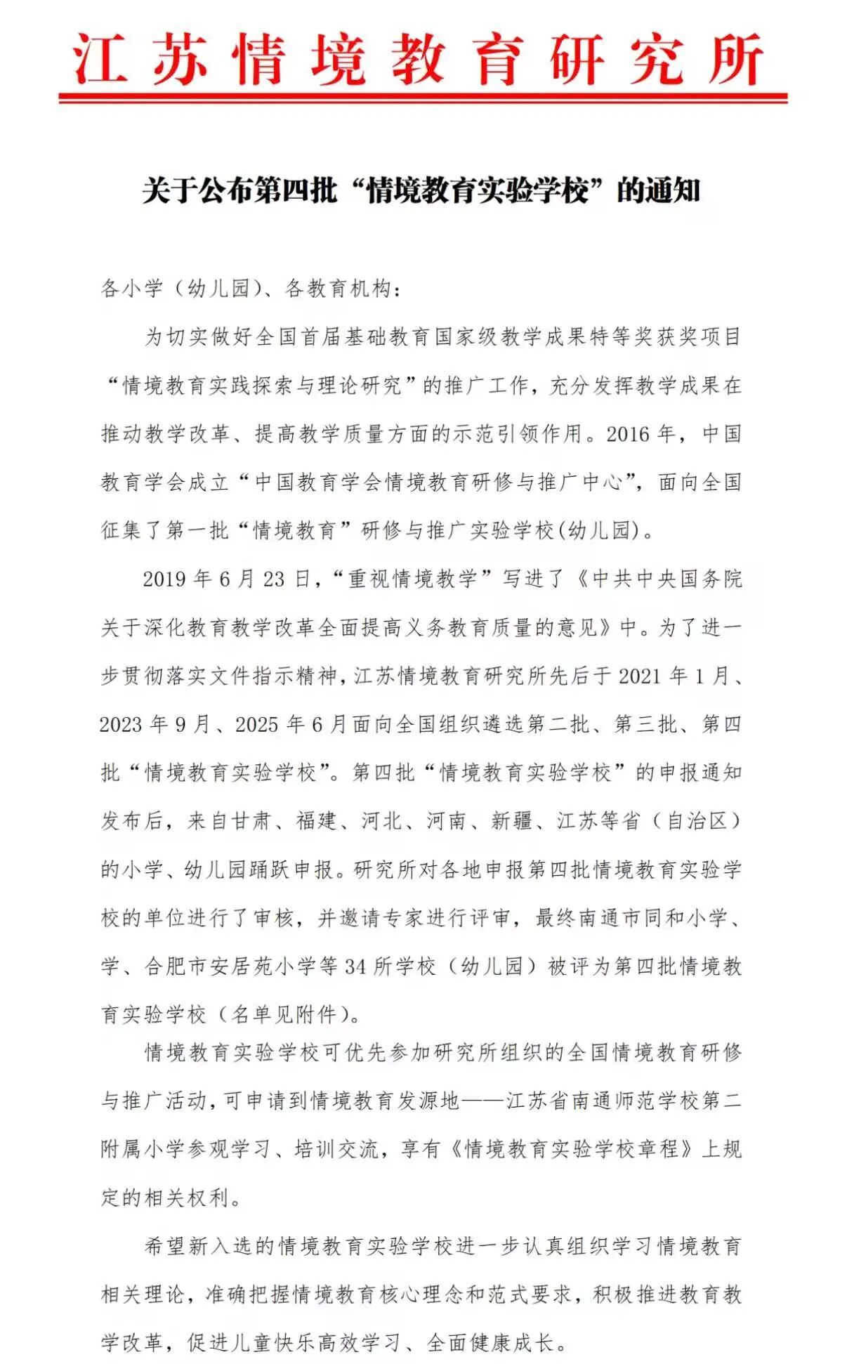 近日,从江苏情境教育研究所获悉,第四批“情境教育实验学校”名单正式公布。在全国34所入选学校中,河北省沧州市运河区实验小学、承德市大石庙中心小学、张家口市桥西区通顺街小学三所学校成功入选,标志着河北省在情境教育实践与推广方面取得重要进展。