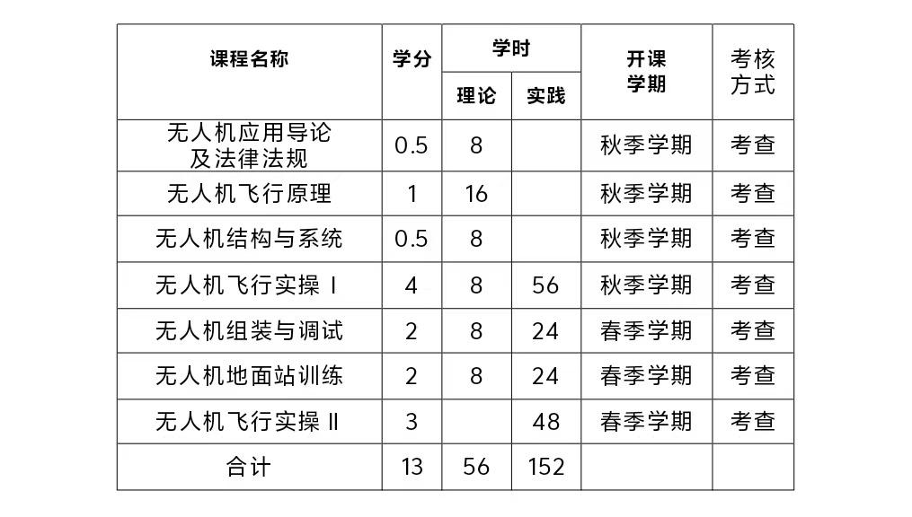 培养过程中,注重引导学生深刻理解并严格遵守航空职业道德与行业规范,树立合规从业意识。通过系统教学,使学生扎实掌握无人机应用法规、飞行原理、系统结构等核心理论知识,构建完善的专业知识体系。同时,强化实践能力训练,让学生熟练掌握无人机组装、调试、操控及维护等关键技能,具备独立解决无人机应用场景中实际问题的能力。最终,培养出既懂理论又善实践,能快速适应行业发展需求,在航拍、植保、巡检、应急救援等无人机应用领域胜任技术操作、服务支持等岗位的复合型人才。
