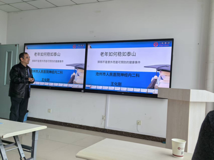 近3个小时活动分两部分:首先由王化刚主任作《老年如何稳如泰山》健康讲座,就如何防摔、血脂血压血糖等疾病的治疗与预防,进行了生动的讲解示范。接着由6位专家为师院退休教工测量血压、血糖,根据受诊人员带来的体检报告和疑问,分析诊断,认真解答,开具药方,指明路径。专家们一一留下联系方式,表示继续提供咨询服务。