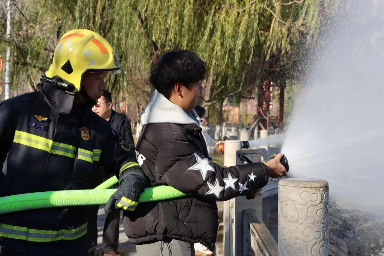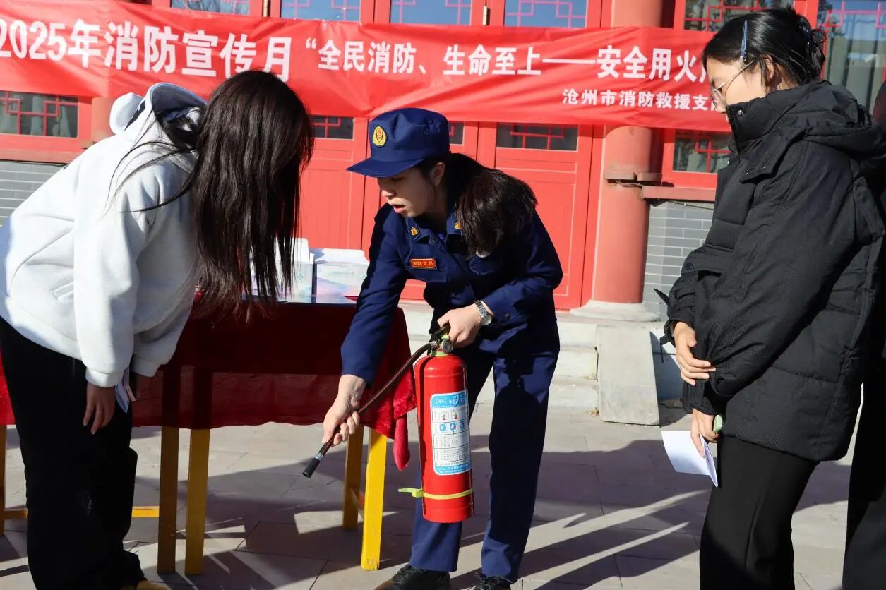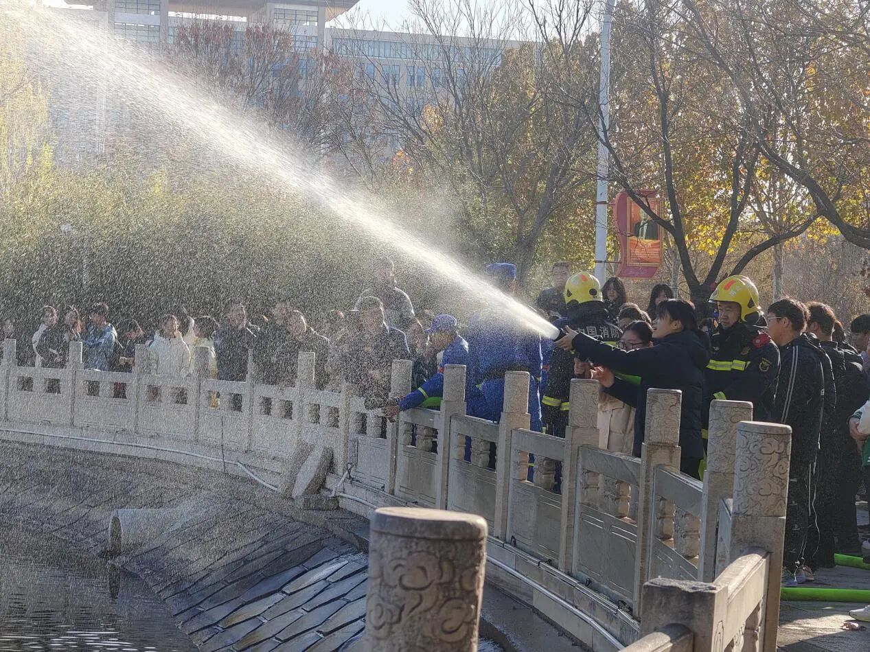 活动伊始,来自沧州市消防救援支队的教官结合冬季校园用火用电高频风险,面向师生讲解消防安全常识及注意事项。他们手持灭火器、消防水带等器材,手把手演示操作要领。现场师生围拢学习,不时点头记录。随后,师生们轮番上阵,实操使用消防水带搭建输水线路、对准模拟火盆精准灭火。宣传展台前,知识问答、印章集赞、Q版贴纸等新颖形式让消防安全知识入脑入心。师生们有序参与,或认真聆听讲解,或亲手实操演练,或积极抢答问题。同学们纷纷表示:“以前只在视频里看过这些消防知识,今天亲手操作才真正掌握了实用技能。”