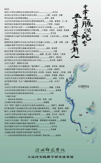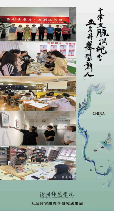 紧扣各专业人才培养目标,将大运河文化与专业课程深度融合,如美术学等专业依托“艺术考察”省级一流课程,组织学生开展运河文化调研与艺术创作,举办大运河主题师生作品展;汉语言文学专业梳理运河沿岸书院教育、驿路诗歌,组织学生参与运河文化研学方案和路线设计;书法学专业以大运河为创作源泉,以书法形式演绎历代文人笔下的大运河,举办“运河书情”毕业作品展,获得业界高度认可;音乐学、舞蹈编导专业挖掘运河漕运号子、南皮落子、沧州民歌,以运河历史故事为蓝本,编排音乐舞蹈剧《运河驿站》;艺术设计学将运河沿岸建筑、民俗风情转化为艺术作品,结合沧州运河文化IP,设计书签、装饰画、非遗衍生品等文创产品;广播电视编导、播音与主持艺术、网络与新媒体等专业创作运河风光摄影、主题视频、音频作品及文创产品等近500件,多部作品被中国教育电视台及“学习强国”平台选用。