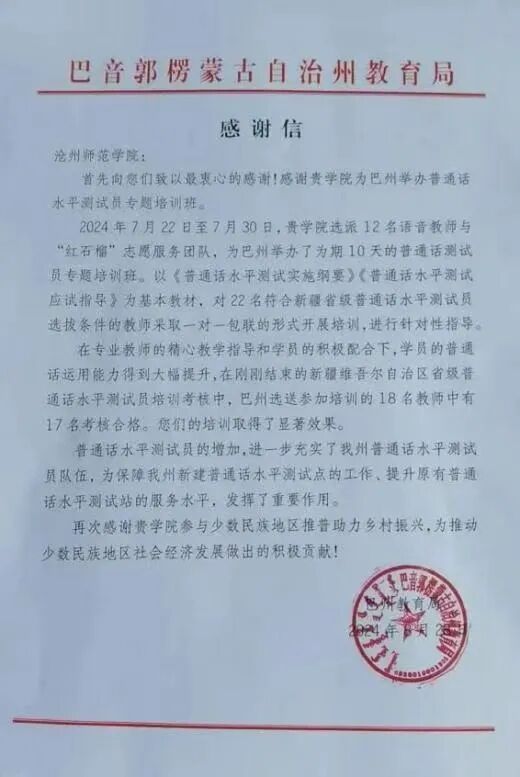 图10 新疆巴州两次发来感谢信,2025年在全疆测试员考核中全部通过三项考试,通过率100%