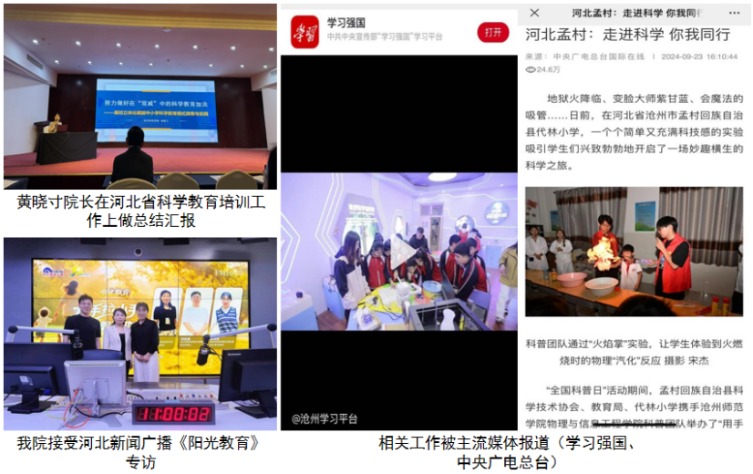 在教育厅组织的全省国家级科学教育实验校校长、省级科学教育实验校校长培训活动中,威廉官网中国官方网站作为高校唯一代表,专题汇报《努力做好在“双减”中的科学教育加法——高校立体化赋能中小学科学教育模式探索与实践》。同时,系列活动引起社会强烈反响,学院曾接受河北新闻广播《阳光教育》专访,系统介绍高校赋能中小学科学教育的模式与经验;开展的多场科普活动被学习强国、人民网等主流媒体报道。