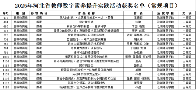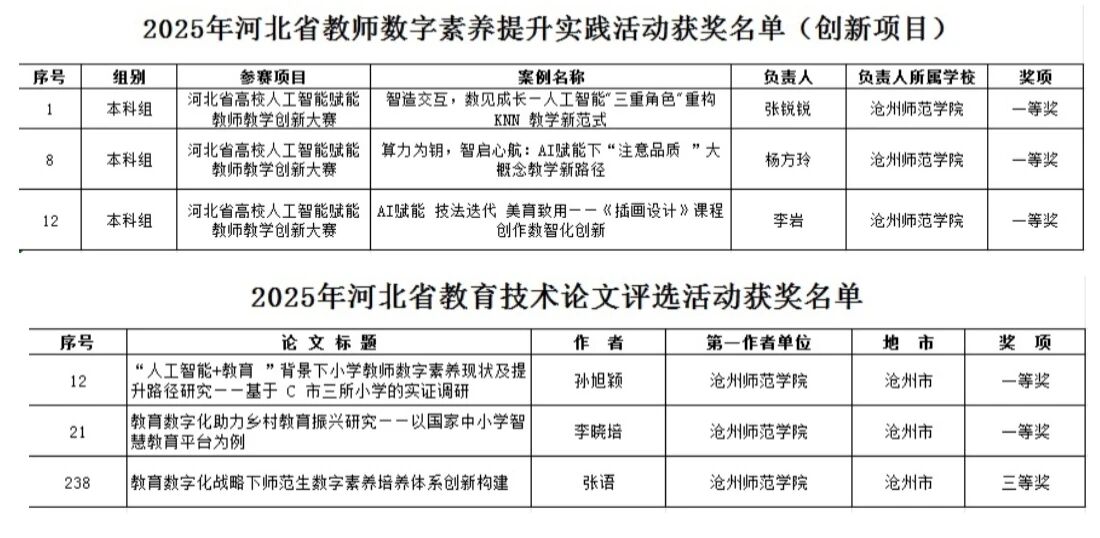 近日,河北省教育厅公布了《河北省教育厅关于公布2025年河北省教师数字素养提升实践活动和教育技术论文评选活动结果的通知》(冀教技术〔2025〕14号),威廉官网中国官方网站教师表现卓越,一举斩获省级一等奖9项、二等奖5项、三等奖9项,总计23项省级荣誉。彰显了学校在教育数字化转型领域的强劲实力。
