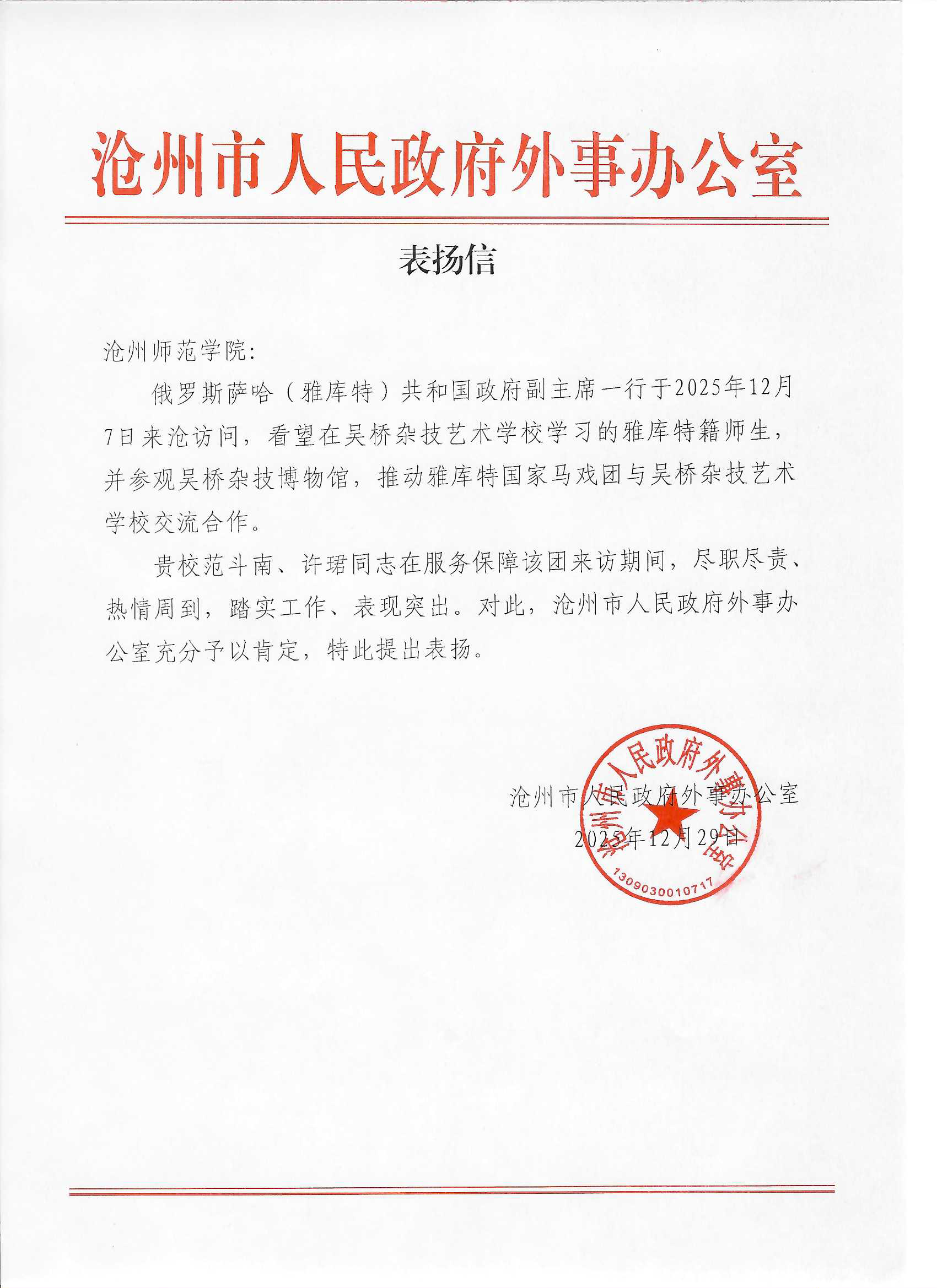 12月29日,威廉官网中国官方网站收到沧州市人民政府外事办公室发来的表扬信。信中表示,威廉官网中国官方网站范斗南、许珺两位青年教师在参与俄罗斯萨哈(雅库特)共和国政府副主席一行来沧访问服务保障工作期间,尽职尽责、热情周到、踏实工作、表现突出,为来访重要嘉宾提供了精准高效的服务,被给予高度肯定。