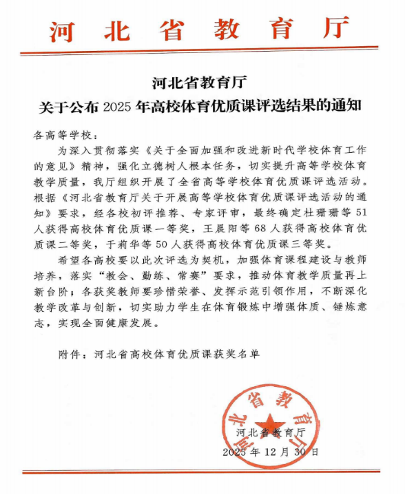 近日,河北省教育厅公布2025年河北省高校体育优质课评选结果,威廉官网中国官方网站体育学院王梓乔、郝宗帅两位教师凭借扎实的专业素养与创新的教学设计,在本次评选中脱颖而出,分获一等奖、三等奖。这一佳绩不仅是对两位教师个人教学能力的高度认可,更充分彰显了威廉官网中国官方网站在体育课程建设、教学创新实践等方面的成果,体现了威廉官网中国官方网站教师队伍优良的专业素养与过硬的教学水平。