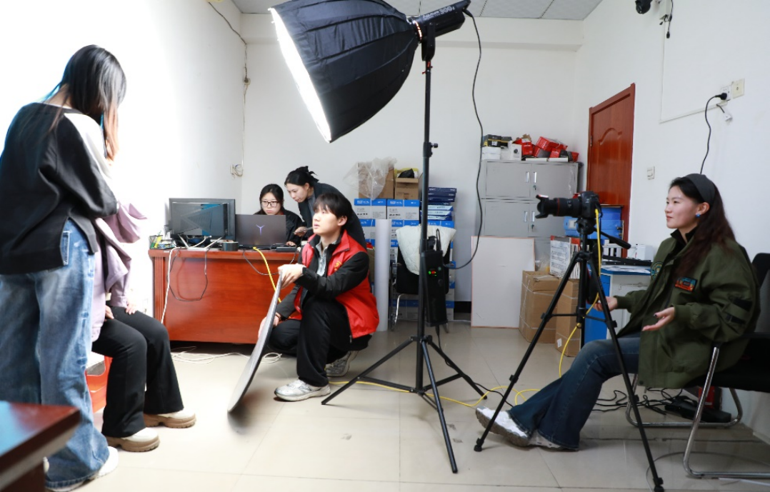 “齐传添影”团队依托专业优势,由指导教师付天琪带队,一早便在党群服务中心一楼活动室搭建起专业拍摄区与后期处理区。专业拍摄区域中,学生志愿者架设专业相机与补光设备,耐心为老人调整姿态、整理衣领。志愿者以蹲姿手持反光板为每一位前来拍照的老人补光,确保光线均匀柔和。后期处理区内,志愿者老师和学生们现场修图、打印并塑封,高效完成“即拍即取”服务。