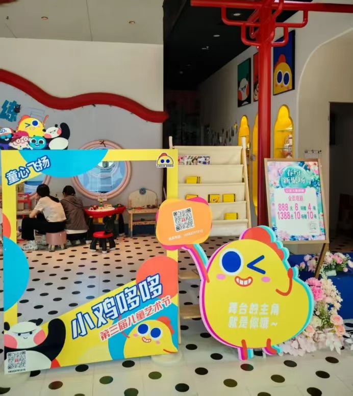 小鸡哆哆作为国内首家沉浸式儿童剧场连锁品牌,以270度全息投影、互动式剧情设计为特色,融合自然科学、国学启蒙等六大主题,打造“玩中学”教育空间。沧州吾悦店自引入齐越传媒学院团队服务后,通过创新的店面视觉设计与线上线下整合传播,进一步强化了本地亲子家庭的品牌认知。