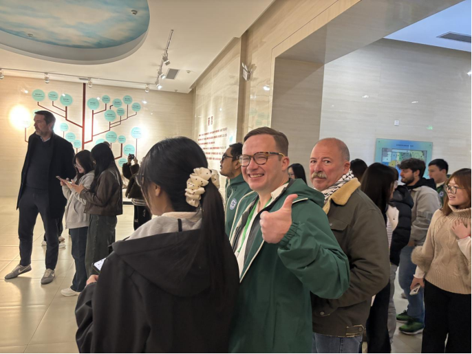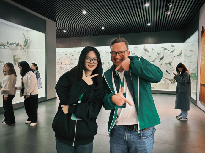志愿者们集结于学术报告厅外,有序陪同外宾及参会教师开启后续行程:首站前往学校的生物标本馆,志愿者以“一对一”“一对二”的精准对接模式,全程紧随外宾左右,及时响应路线引导、物品协助、问题解答等需求。同学们始终保持专注与礼貌,以细致的随行服务保障了参观节奏的流畅。