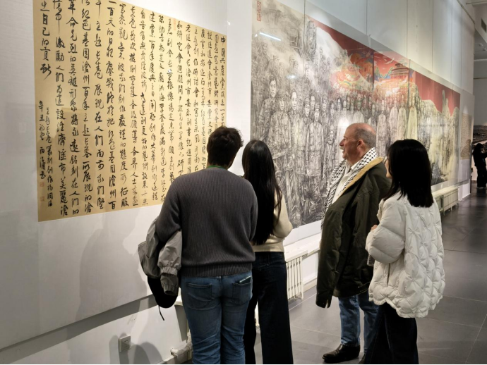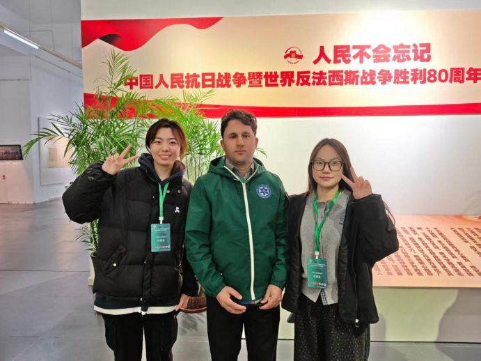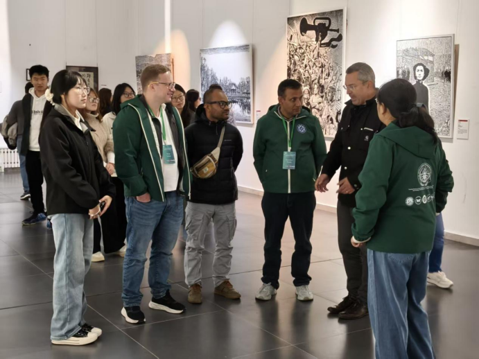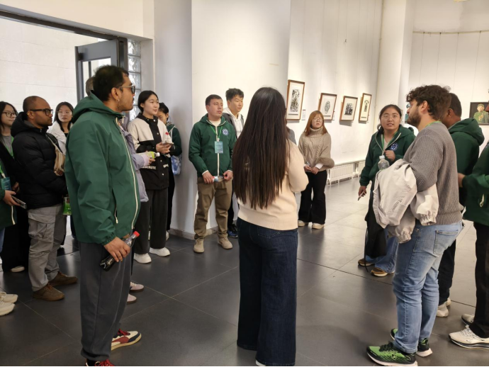 随后的行程中,志愿者们陪同外宾前往美术馆参观反法西斯胜利主题画展。同学们以专业且礼貌的互动姿态全程陪同,在恰当处进行讲解与答疑,既保障了观展信息的有效传递,又维系了观展的肃穆氛围。用餐环节,志愿者们主动协助协调席位、传递物品,以周到细节让外宾感受到暖心关怀。活动步入尾声,志愿者们迅速灵活分组,部分同学主动陪同有需求的外宾漫步校园,沿路介绍校园景致与文化底蕴,其余同学则有序引导外宾返回学术报告厅,大家以默契协作为此次活动画上圆满句号。