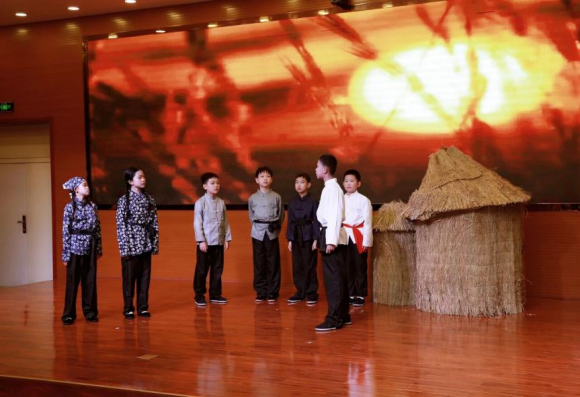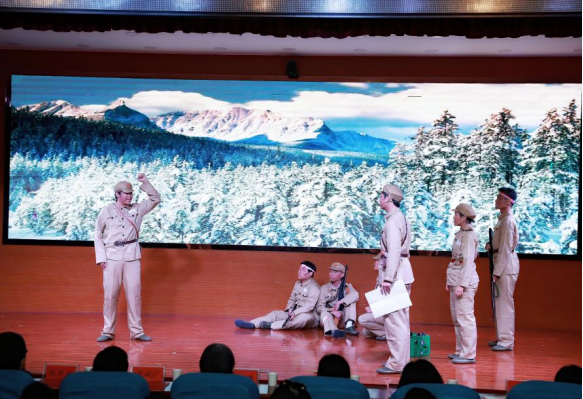 展演阶段,小演员们情绪饱满、慷慨激昂,用稚嫩的嗓音呐喊出壮烈的誓言,用生动的演绎再现了一个个可歌可泣的红色故事。马克思主义学院“红心向党”思政剧社带来的《血战松骨峰》最后登场,展现了志愿军战士用血肉之躯死守阵地的钢铁意志,感染了在座的每一名观众。《英雄赞歌》响起,台下师生报以热烈掌声,将整个展演推向高潮。