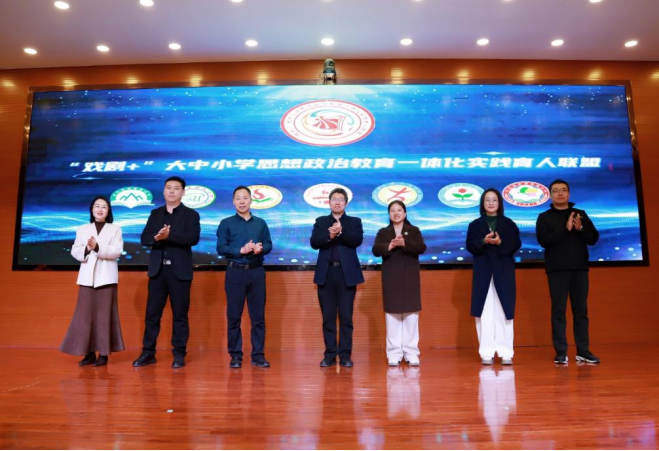 沧州市教育局领导及各大中小学代表宣布“戏剧+”大中小学思想政治教育一体化实践育人联盟成立。联盟旨在打破学段壁垒,以戏剧为载体将思政教育融入青少年成长场景,是大中小学思政课一体化建设的重要举措。