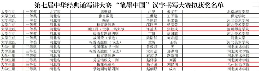 近日,由教育部、国家语委举办的第七届中华经典诵写讲大赛“笔墨中国”汉字书写大赛拟获奖作品完成公示。评委会对全国参赛作品进行严格评审,最终选出获奖作品4981件,其中毛笔类大学生组500件。