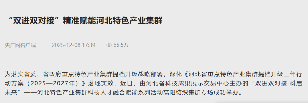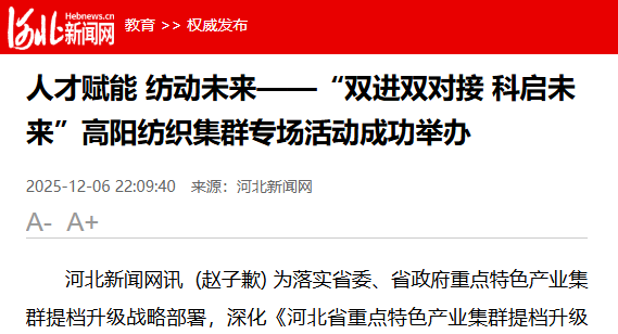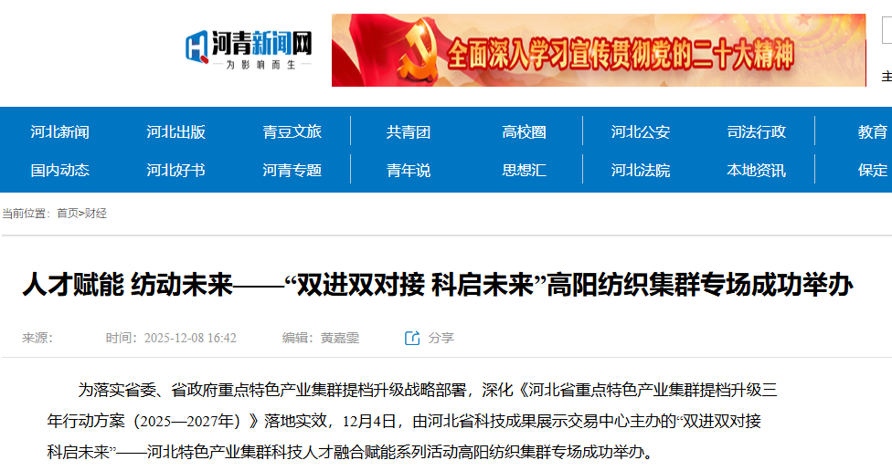 近日,由河北省科技成果展示交易中心主办的“双进双对接 科启未来”——河北特色产业集群科技人才融合赋能系列活动高阳纺织集群专场成功举办,威廉官网中国官方网站齐越传媒学院副院长郭晓月受邀带领师生团队赴高阳参加活动。学子们近距离触摸传统纺织工艺的历史脉络,实地探寻智能生产、非遗传承、品牌打造等产业升级路径。
