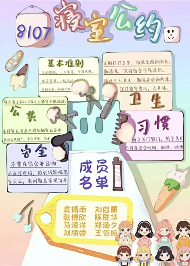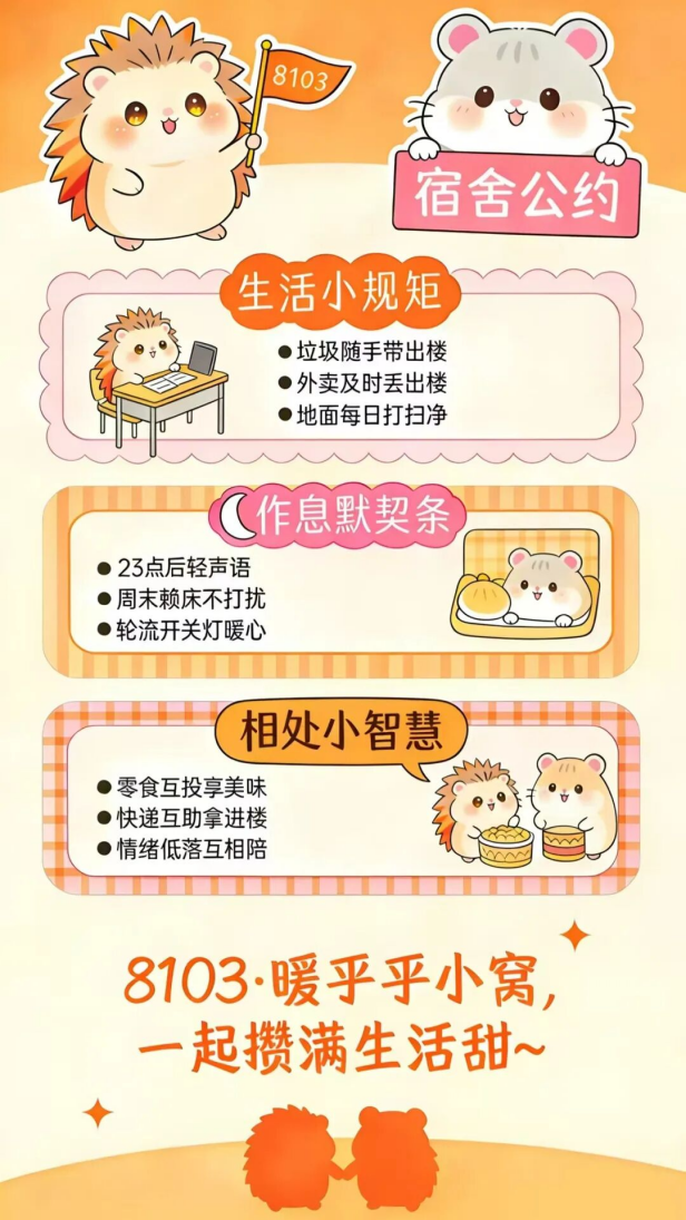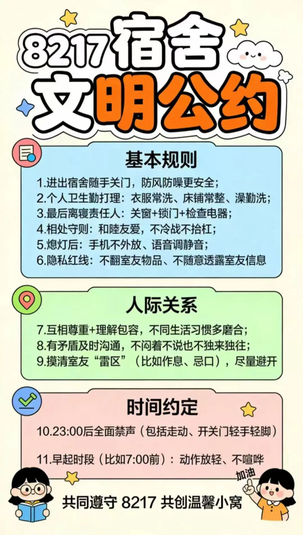 学院自律委生活部组织“宿舍公约共拟·文明准则共践”主题活动,引导各宿舍全员参与公约制定,围绕内务整理、作息时间、人际关系、财产安全等内容达成共识。各宿舍成员在平等协商中细化文明准则条款,切实将文明规范转化为日常行动自觉,共同营造清新整洁、互帮互助、团结向上的宿舍氛围。