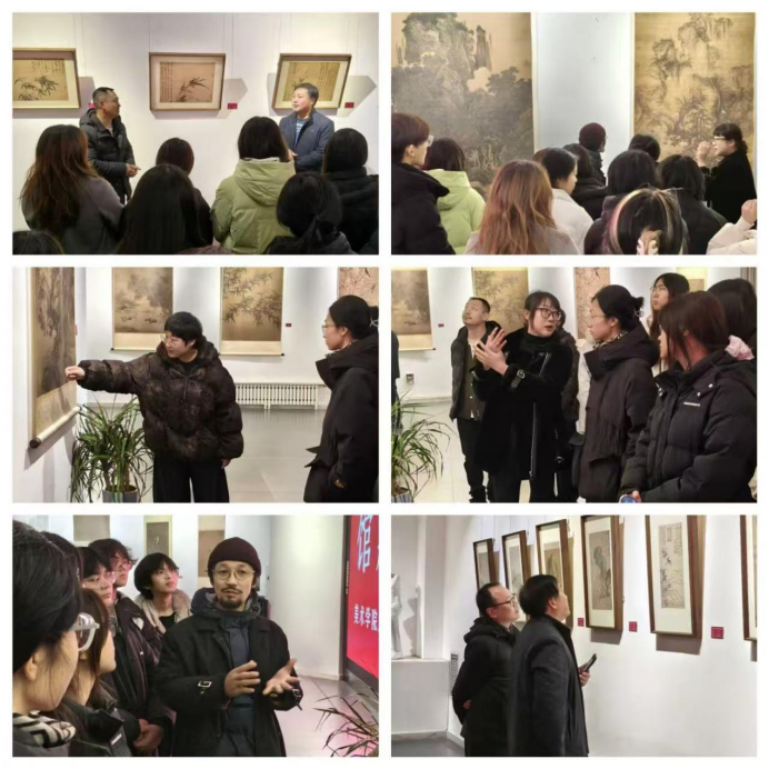 中国画专业同头课教师任意、安永平、张震带领2025级学生以展为课开展沉浸式教学研讨。师生结合理论从技法切入,逐幅剖析作品艺术特色与文化内涵。细研笔墨技法与宋代“格物致知”“天人合一”理念,体悟构图与墨色营造的意境,答疑并梳理技法传承,强化文化传承责任感。该模式通过将理论具象化,实现了专业与审美素养的协同提升。
