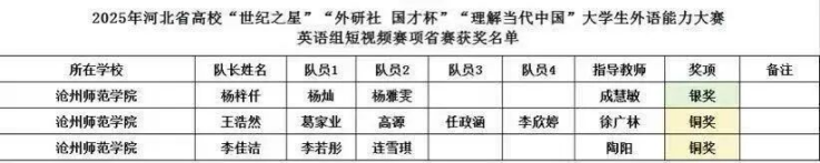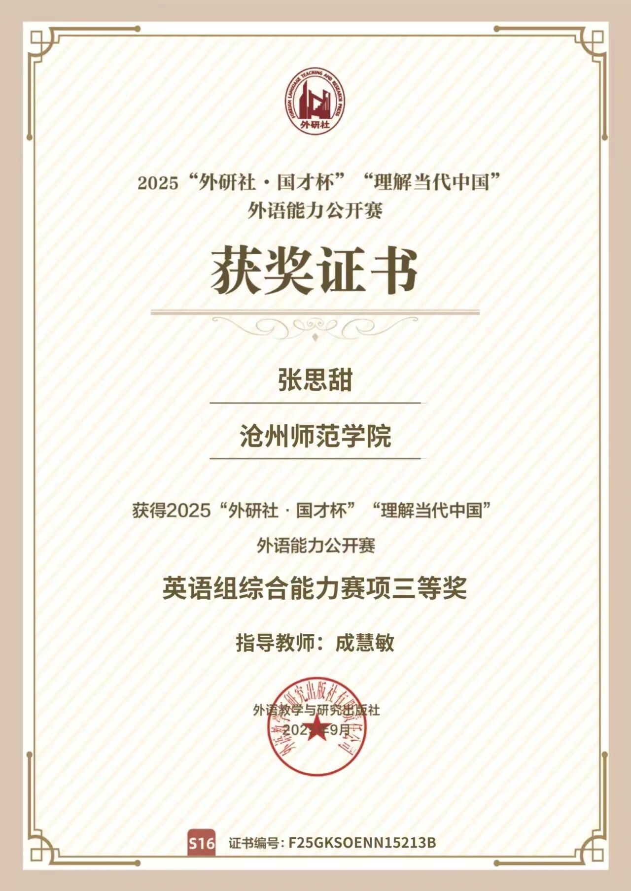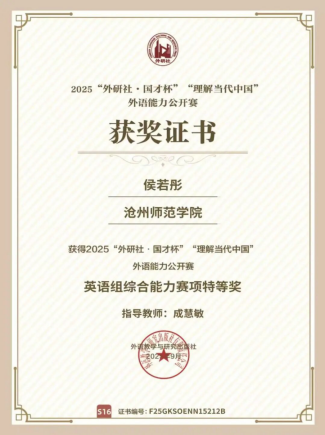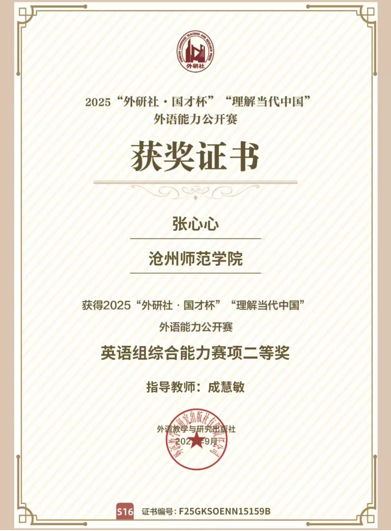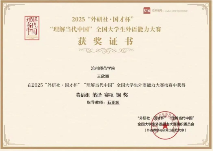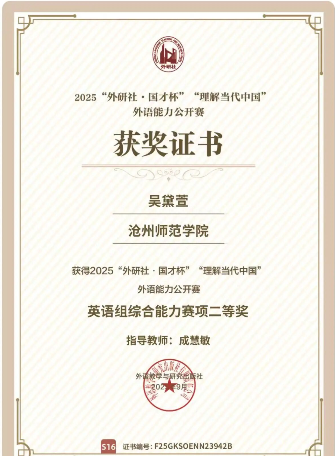 为贯彻落实“以赛促学”的教育理念,提高学生的外语综合应用能力,激发学生学习外语的积极性与主动性,教育学院鼓励学生积极参加各项英语比赛。近日,2025年“外研社·国才杯”“理解当代中国”大学生外语能力大赛国赛落下帷幕,教育学院学生在该项比赛中取得了优异成绩。