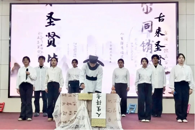 中兴书法社将经典传诵和书法创作相融合,创新演绎李白千古名篇《将进酒》。一边是声情并茂的诗文朗诵,激昂文字诠释诗仙的洒脱胸襟;一边是行云流水的现场书法创作,笔锋流转间定格诗中名句的隽永意境,为观众呈现出一场诗与墨的双重盛宴。