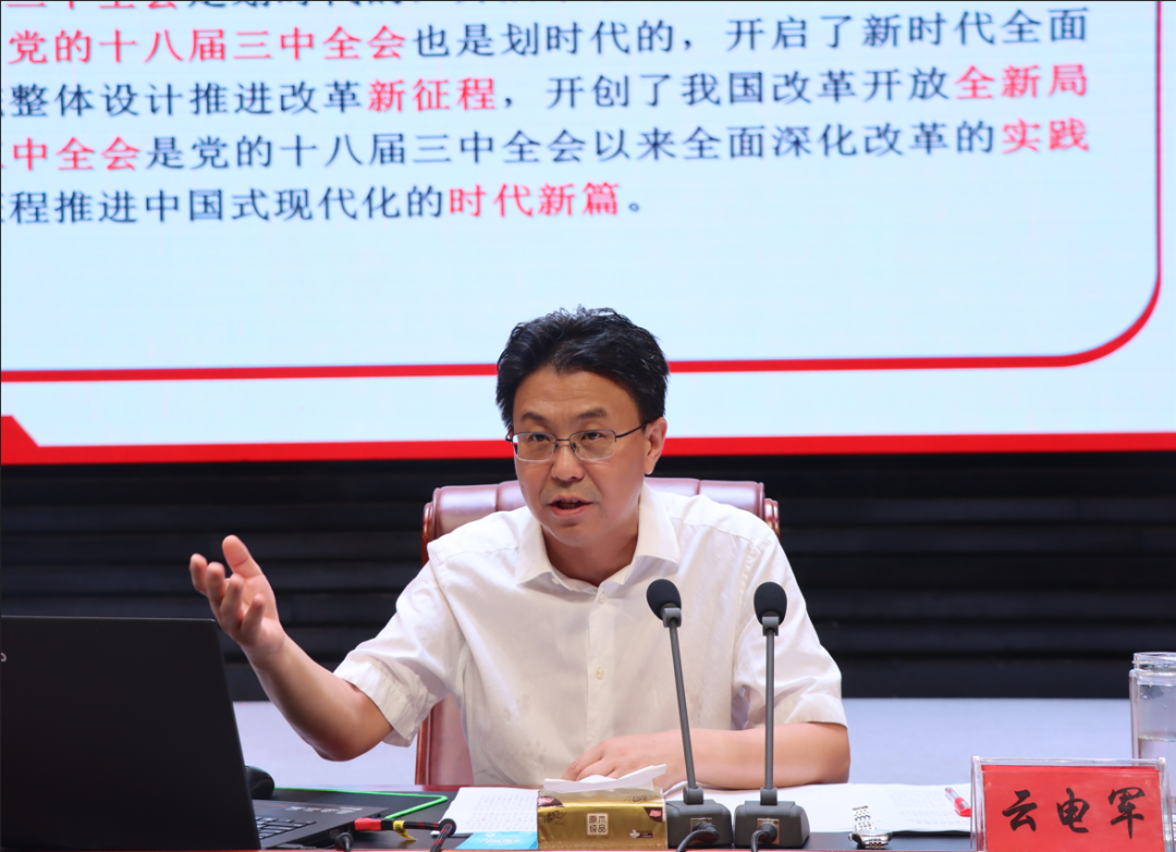 云电军以《以进一步全面深化改革 推进教育高质量发展》为主题,全面介绍了党的二十届三中全会的概况,深刻阐释了全会的主题和伟大意义,细致解读了进一步全面深化改革的指导思想、总目标、重大原则和重大举措,系统剖析了以改革为动力为中国式现代化贡献教育力量的路径。他指出,党的二十届三中全会从党和国家事业发展全局的战略高度出发,发出了将新时代改革开放进行到底的最强音,并深刻诠释了新时代新征程上改革开放要干什么、能干什么、怎么去干的重大问题,对新时代进一步全面深化改革、推进中国式现代化作出了科学擘画与战略部署。审议通过了《中共中央关于进一步全面深化改革、推进中国式现代化的决定》,这是指导新征程上进一步全面深化改革的纲领性文件,是在新的历史起点上推进全面深化改革向广度和深度进军的再次总动员、总部署,必将为实现党的第二个百年奋斗目标提供强大动力和制度保障。